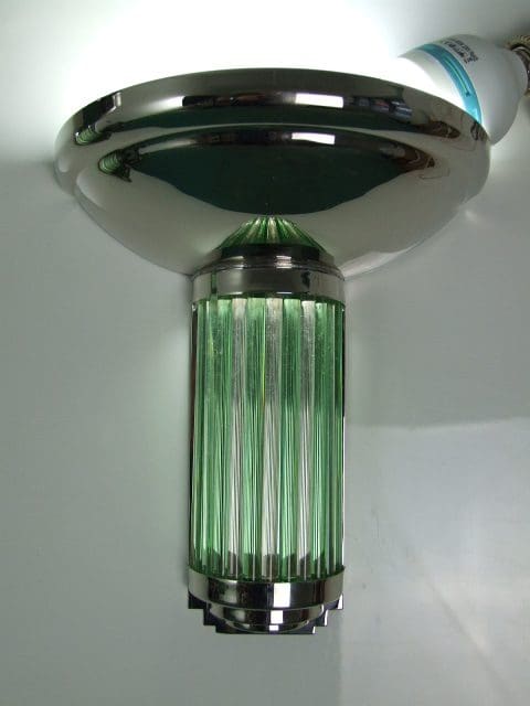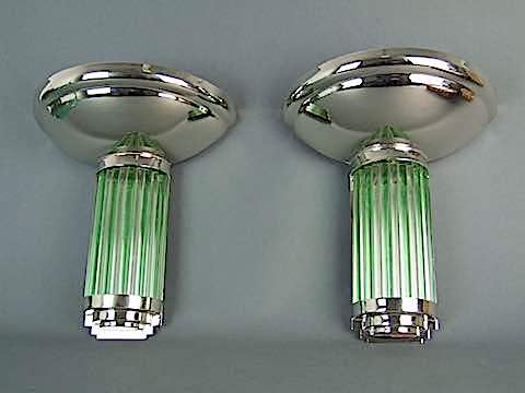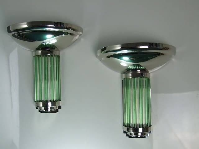 Pair of contemporary chrome modernist wall uplights with single bulb holder to the top dish shade.