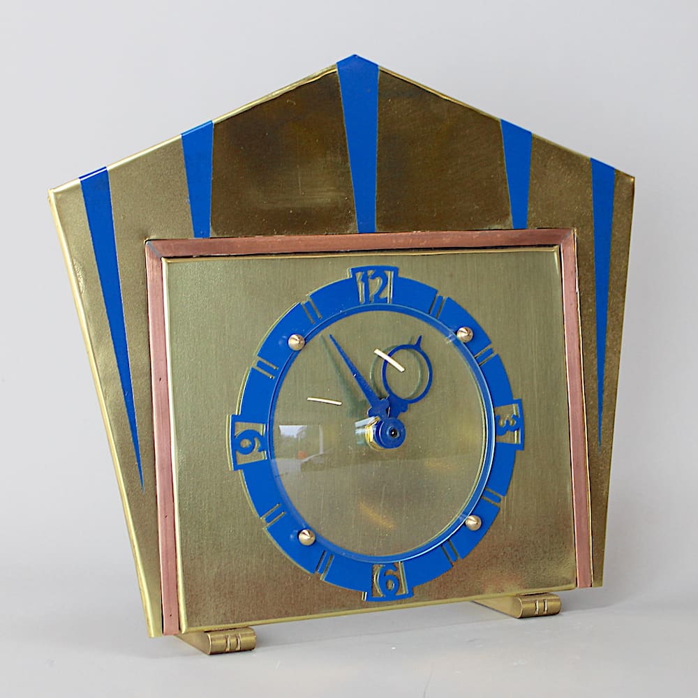 Beautiful English art deco gold and blue enamel painted clock.