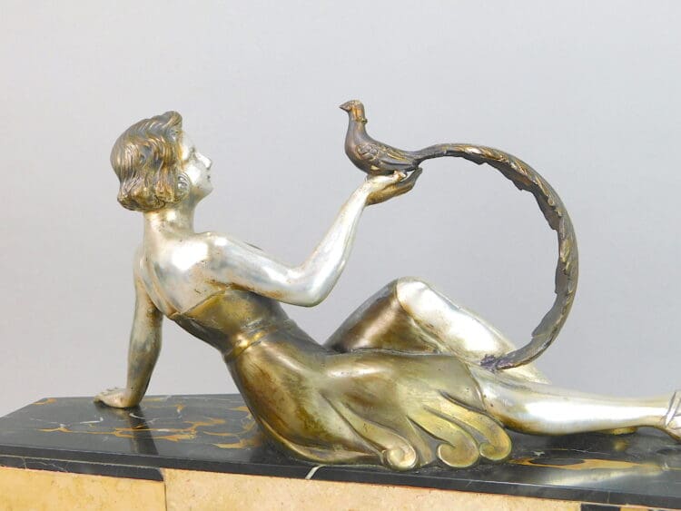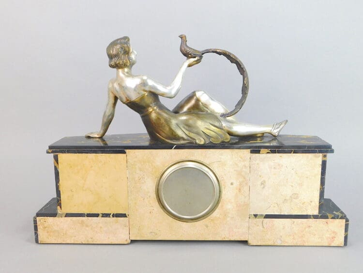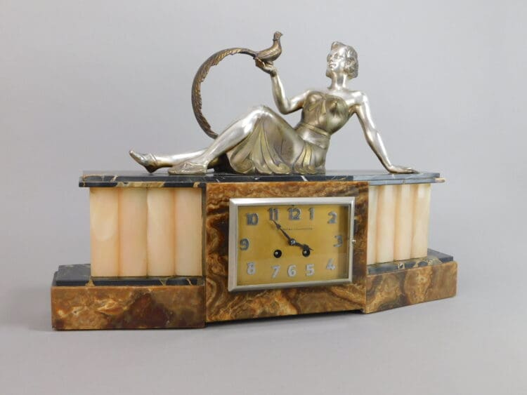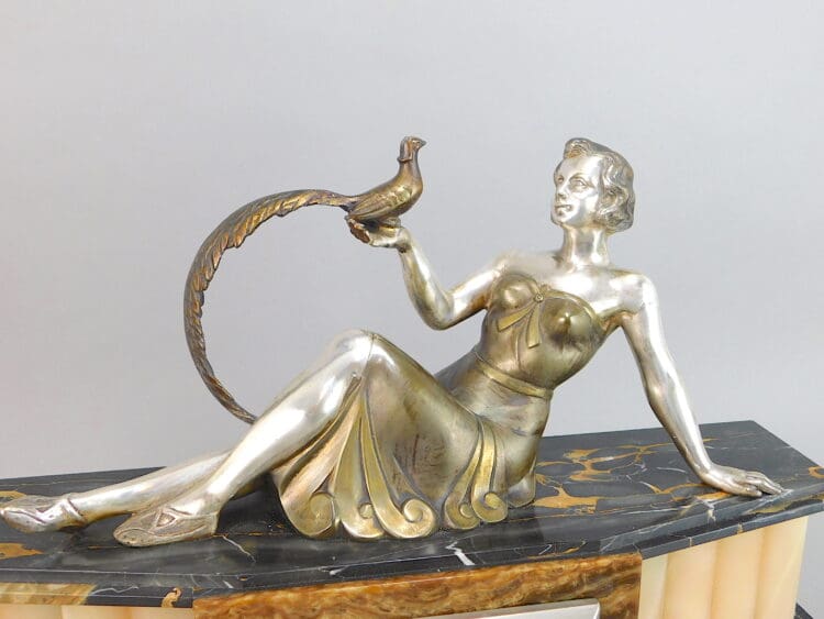 French Art Deco marble and onyx clock with a spelter lady holding a bird of paradise to the top. The lady has a silvered patina with a bronze patinated dress.