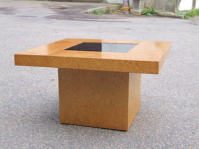 amboyna low coffee table with central glass panel. Purchased in France but unknown manufacturer and date. Amboyna is now a rarely used wood for furniture as it is a premium timber and very expensive.