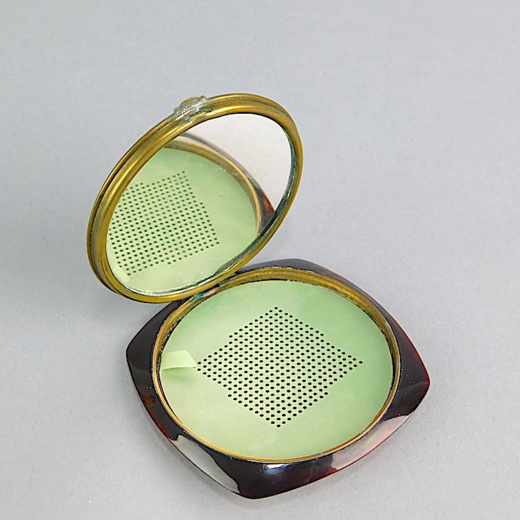 A French phenolic art deco powder compact with a Cocteau design to the lid. The design shows a man in top hat and lady in silver leaf. Inside is a mirror to the lid and phenolic sifter panel.