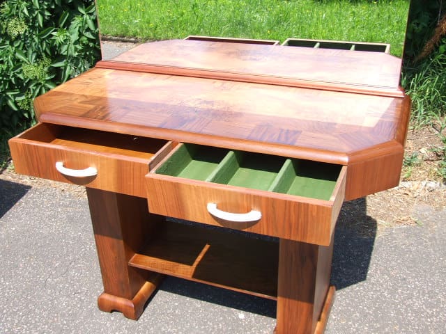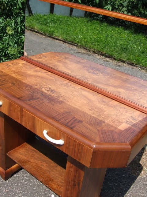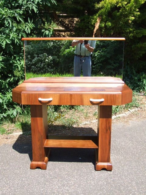 Walnut console table possibly previously a server table in a dining room or hall table. Mirror back panel with two felt lined drawers each having a cream phenolic handle. The mirror back could be replaced, removed or reduced.