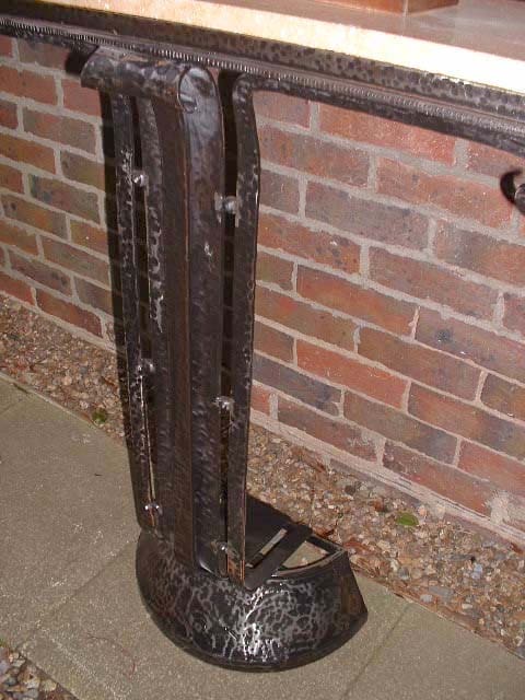 With a semi-circular base and layered iron strips running vertically and featuring ball and scroll detail.