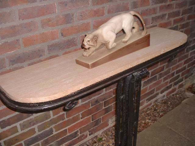 A French art deco wrought iron console table beneath a beige marble top.