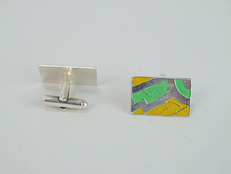 French art deco enamel and silver plated geometric cufflinks with twist fitting.