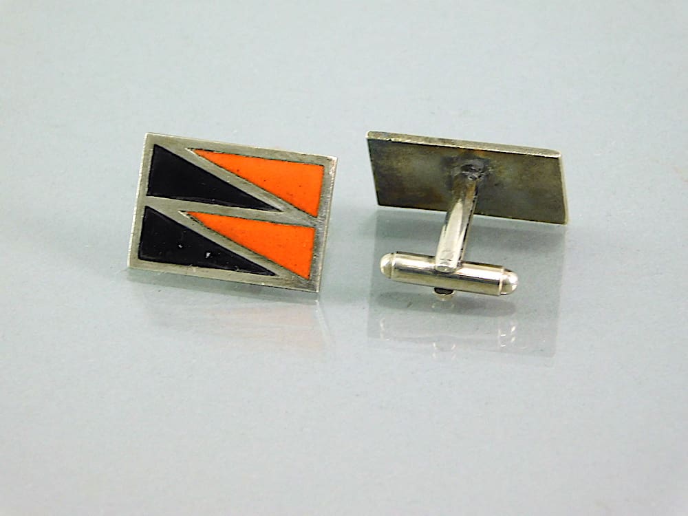 Large modernist geometric design cufflinks with enamel zig zag patterning each with twist catch to the back.