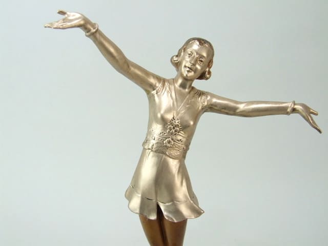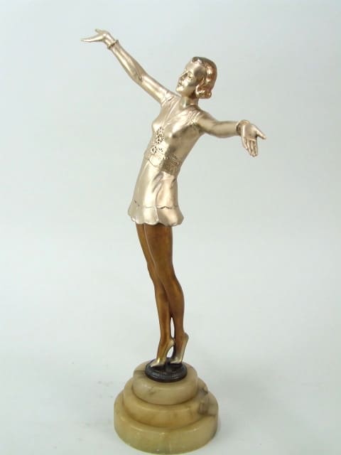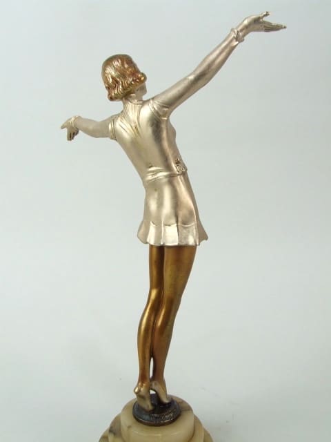The second of a matching pair of dancers, this one also made of spelter and both mounted on identical stepped circular alabaster bases. Very similar in colouring with some highlights to the patina. Possibly designed by Lorenzl.