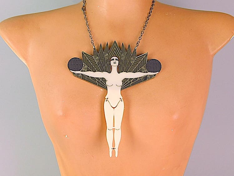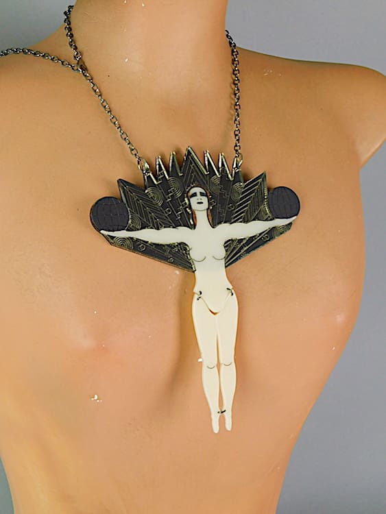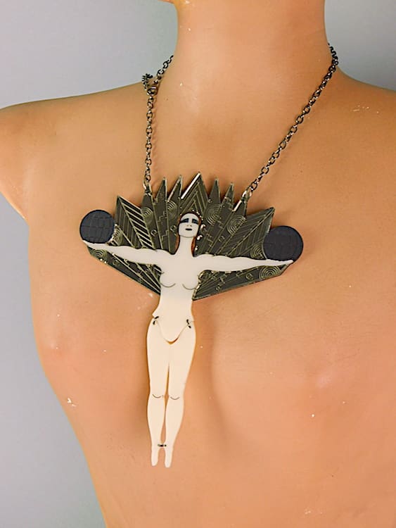 Large phenolic resign with a silvered geometric mirror fan detailing. Articulated hips. Fitted with a gunmetal chain and choke ring.
