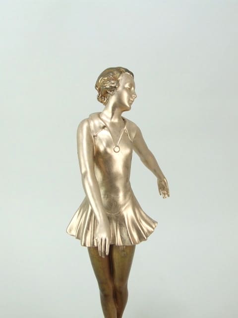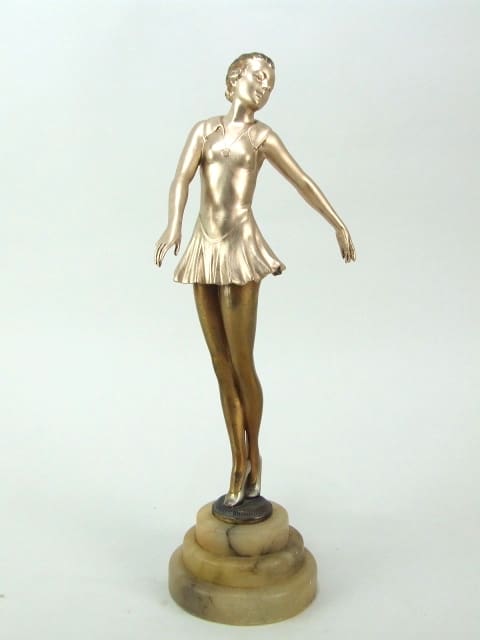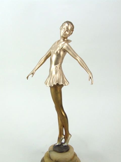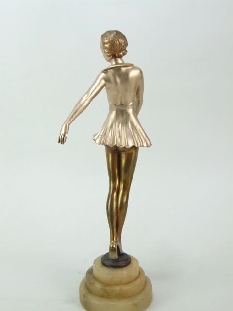 One of a matching pair of dancers made of spelter and mounted on a stepped circular alabaster base. Some highlights to the patina. Probably designed by Lorenzl.