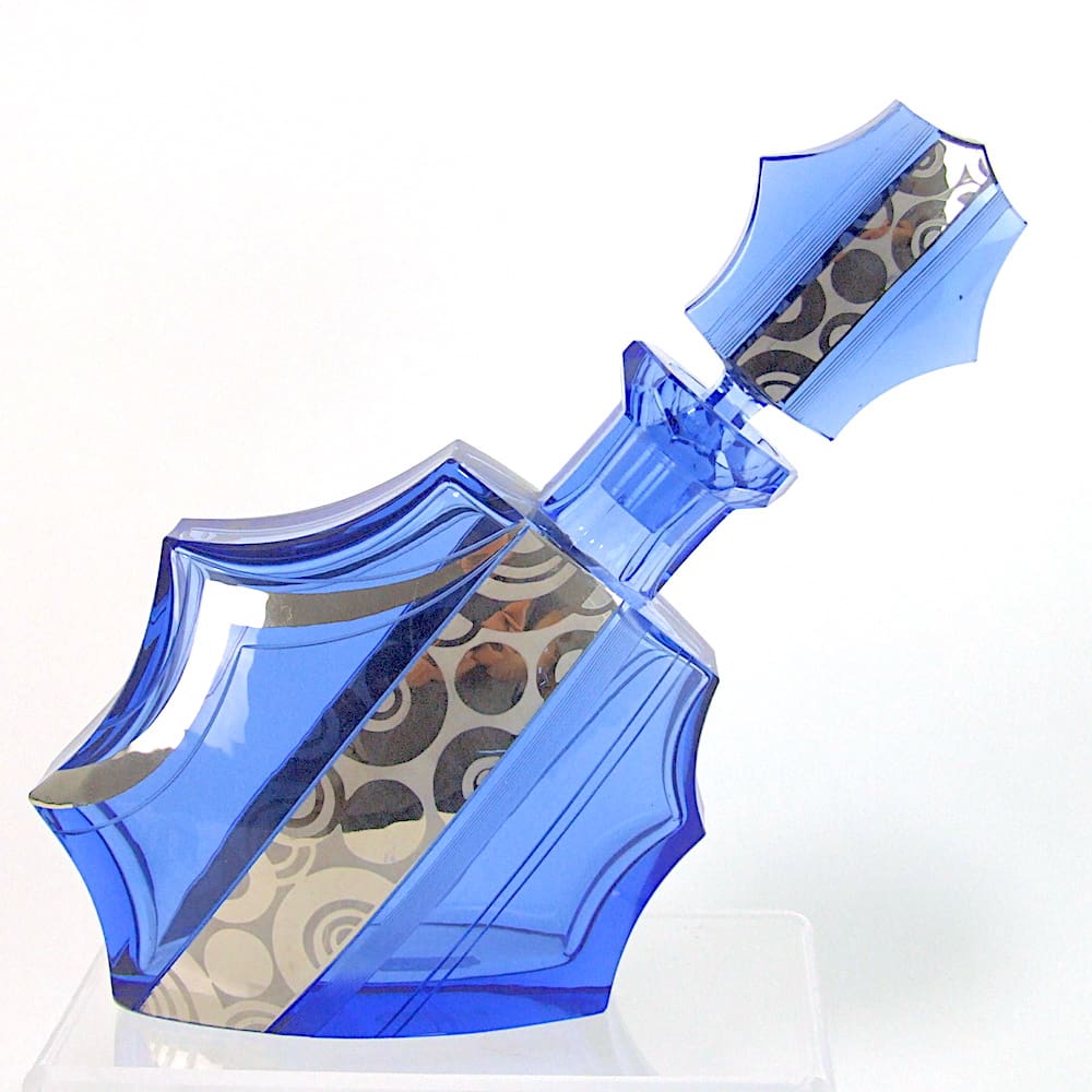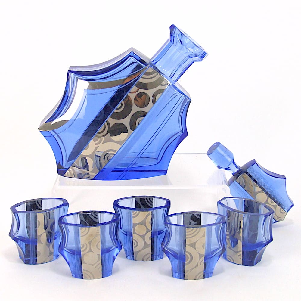 French art deco decanter set of decanter and 5 glasses with geometric detail.