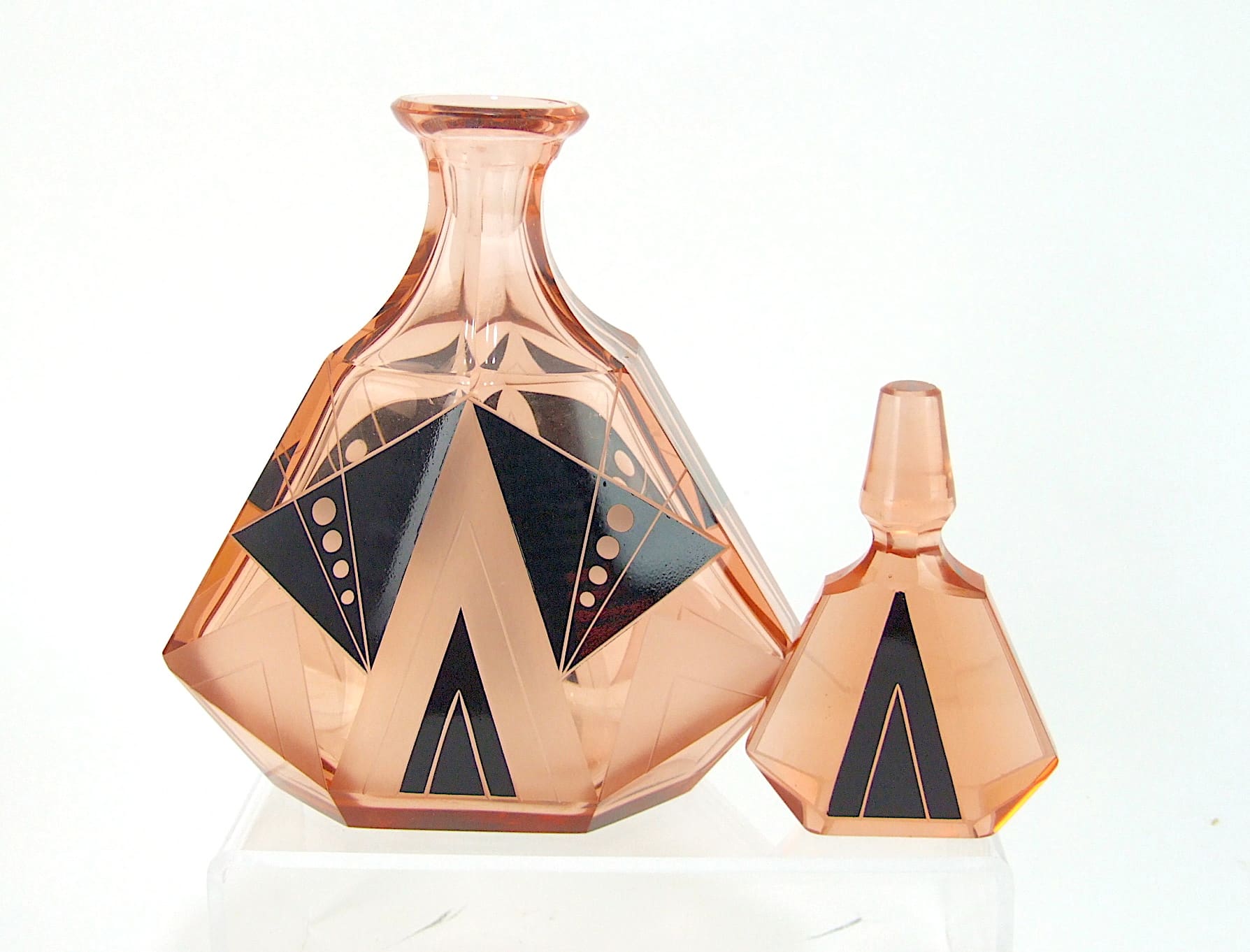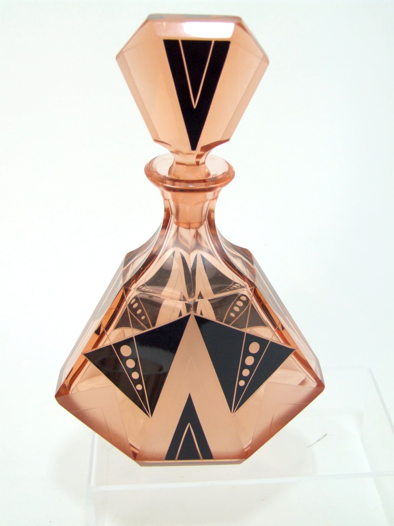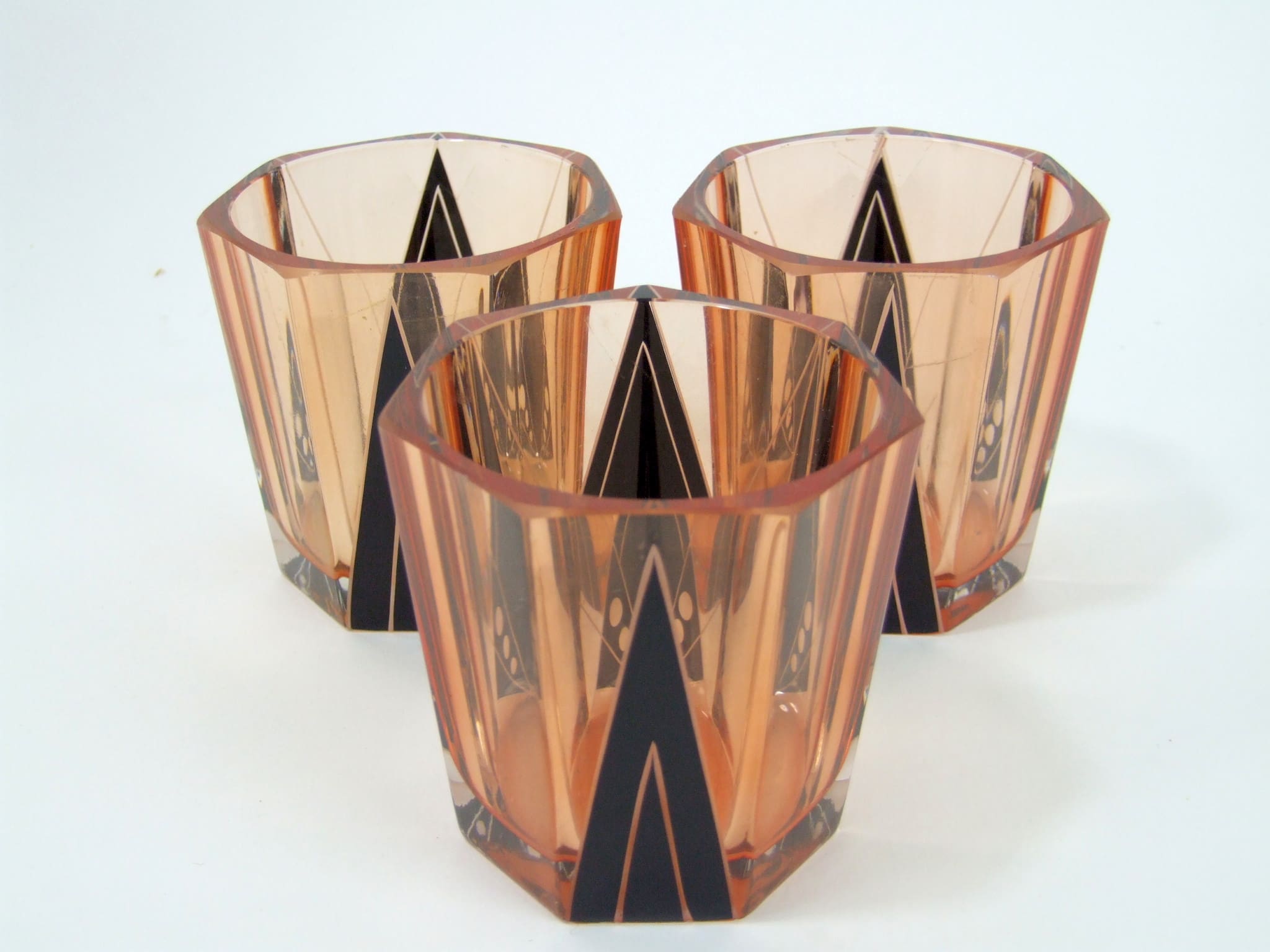 Czech Palda art deco decanter set of Peach decanter and 6 whisky glasses.