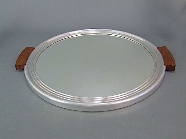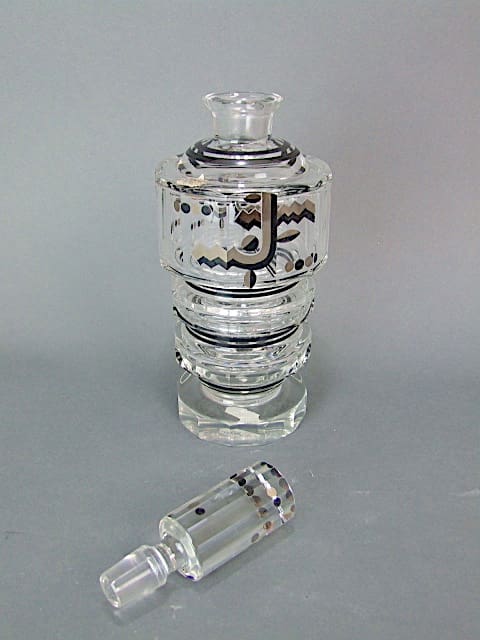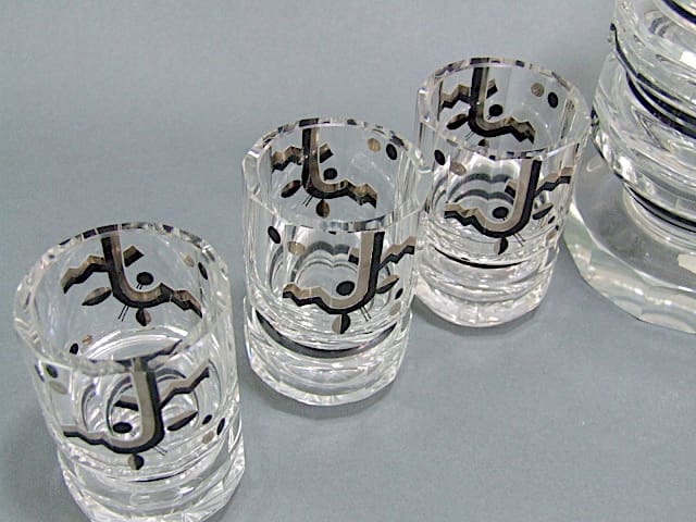 Modernist Czech glass decanter set and tray, 8 pieces in all. The decanter and glasses have zig zag patterning in silver and black and it still retains its old shop label from new – which reads FFU Bohemia. The tray has wooden handles and a mirror glass base.