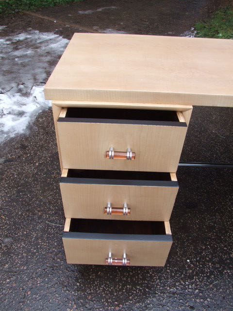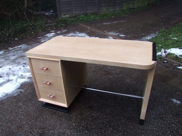 French light beech modernist desk with 3 drawers with peach glass handles and chrome foot bar. Ebonised scroll end, base and drawer tops.