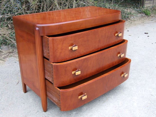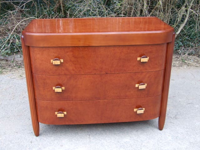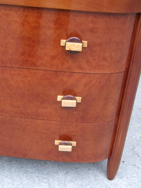 French art deco walnut chest of drawers with typical Leleu style (unsigned) tapering ribbed legs to the front. Three drawers each with a geometric 2 tone phenolic handles.