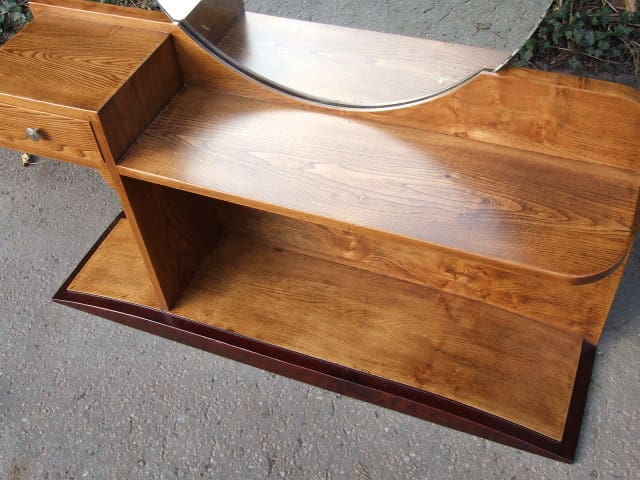 A smaller French art deco dressing table with single drawer and circular mirror. Lovely shaped base and curved side panel with lovely contrasting woods.