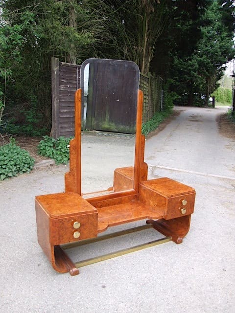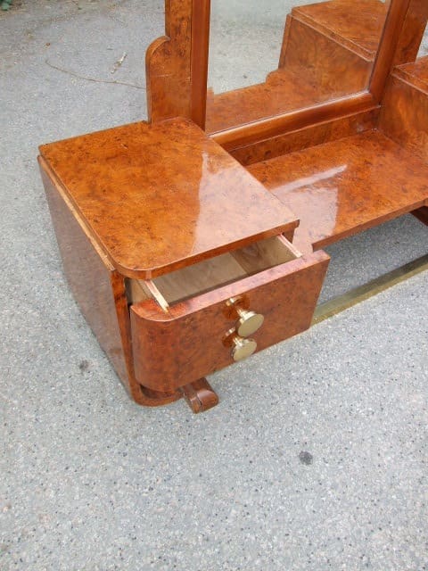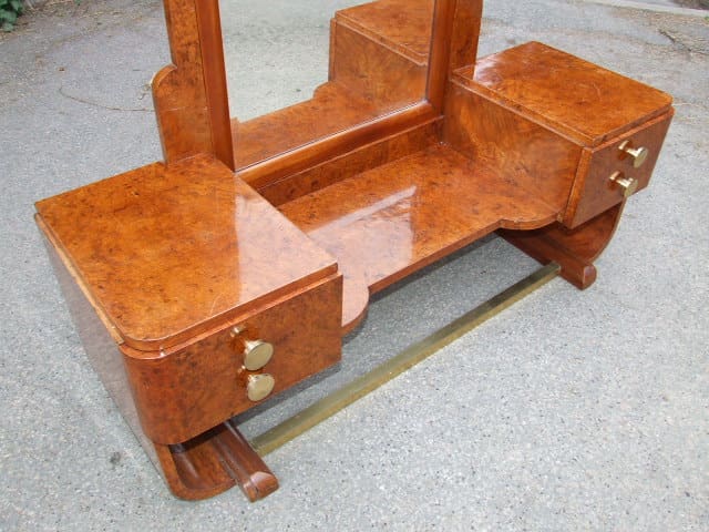 French art deco dressing table. Beautiful 1930’s French amboyne dressing table. With tilting cheval mirror to the centre and two drawers to each side, boat bottom with central bronze bars and matching handles.