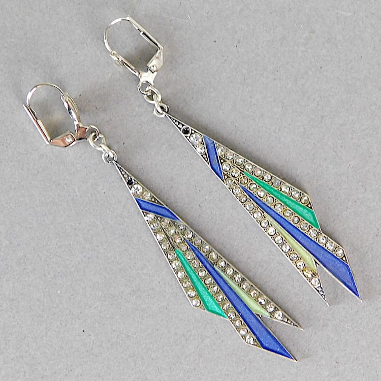 French enamel and diamonte earrings. Fitted with silver trigger clasp for pierced ears.