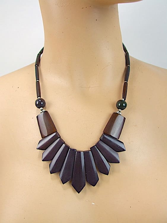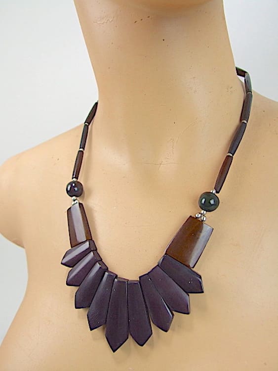 Brown phenolic fringe necklace – bears an A logo to the end of the chain but I do not know who the maker is.