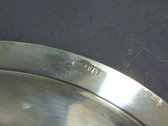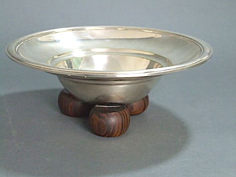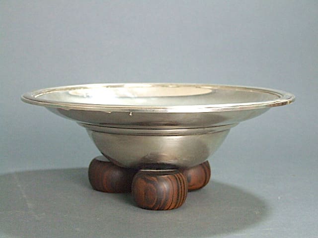 Top quality French fruit bowl, I believe designed by Luc Lanel for Ravinet and Denfert. Silver plated bowl with three bun feet in macassar ebony.