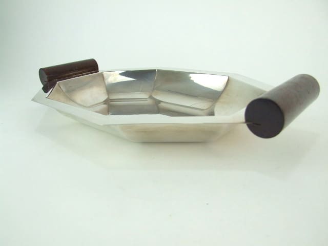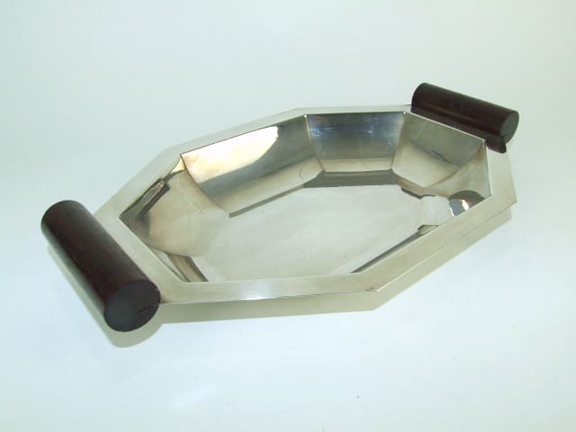 French art deco rosewood handled silver plated brass fruit bowl. Bearing a hall mark and JA 905, possibly by Jean Aniel.
