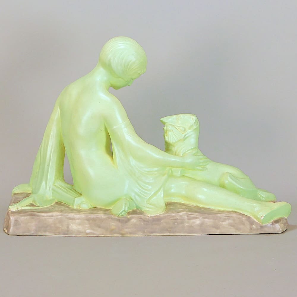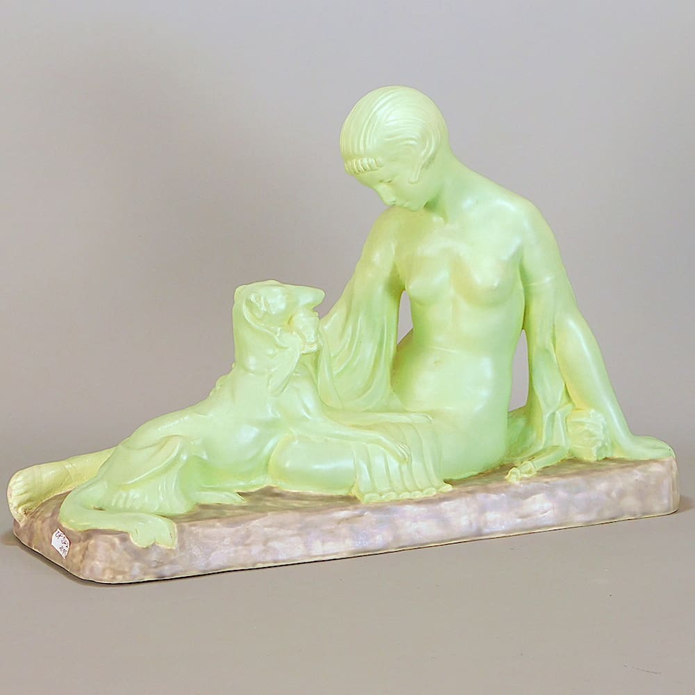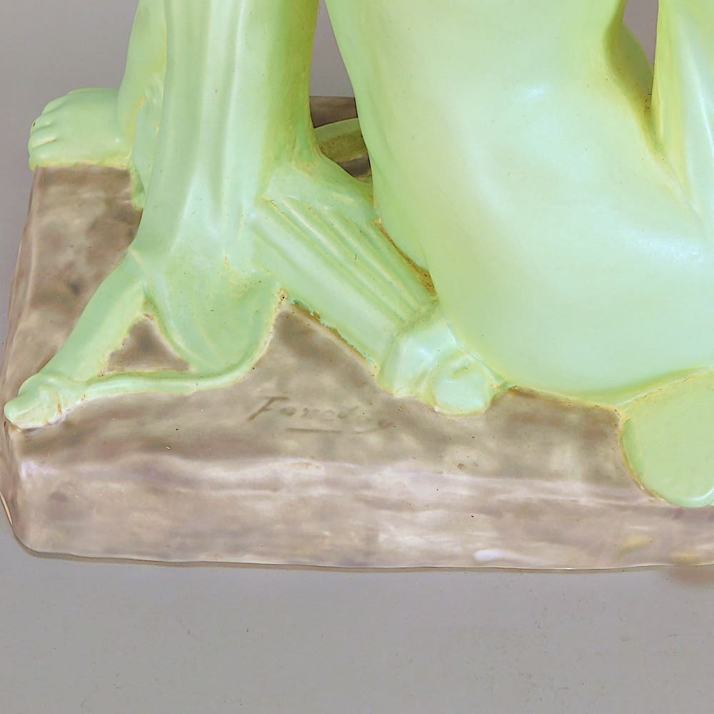 French Ceramic art deco Diane and dog statue signed Foretay.