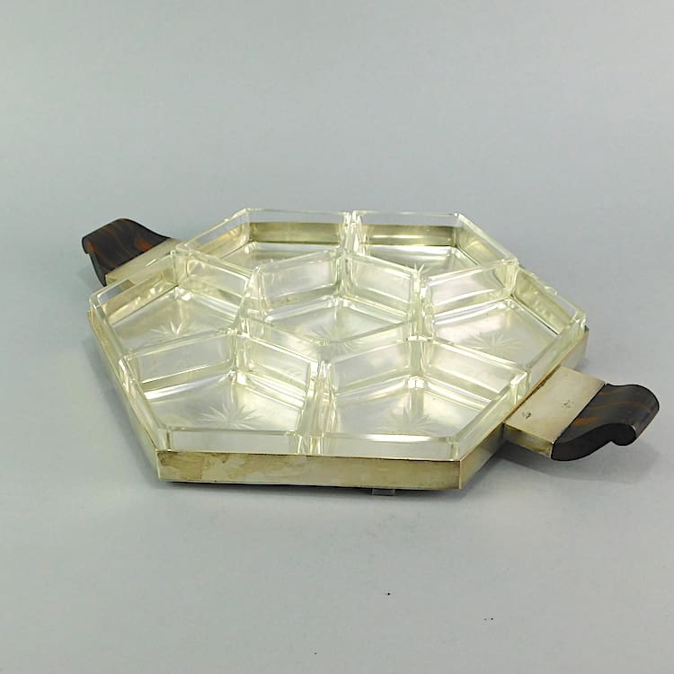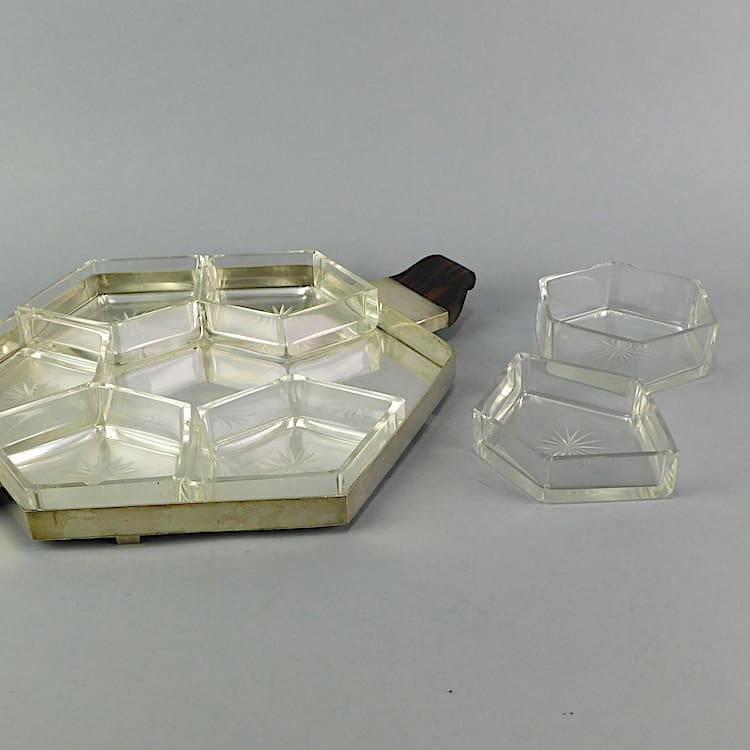 Consists of seven central dishes with star etched bases and bottom tray section with stylish macassar ebony handles.