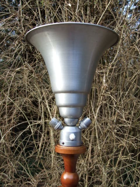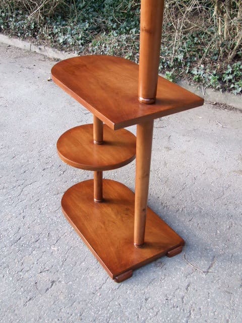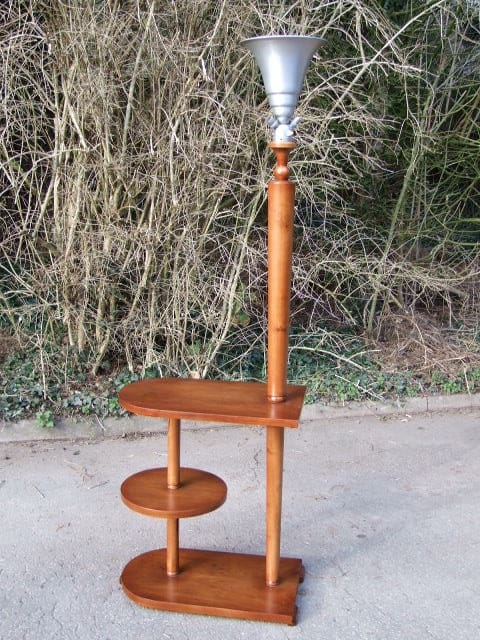 Medium walnut French art deco-modernist side table with aluminium uplighter lamp. The metal uplighter shade has twin exterior bulb holders for reading and a single uplighter lamp within. It also has an on/off switch in the body.