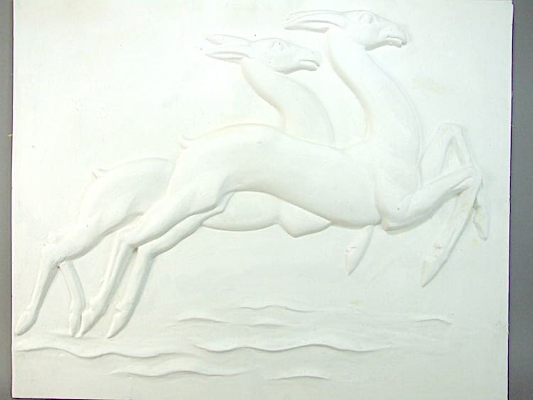 French gesso leaping deer panel, re enforced and mounted on a back board. Two hanging hooks to the back. Unframed.