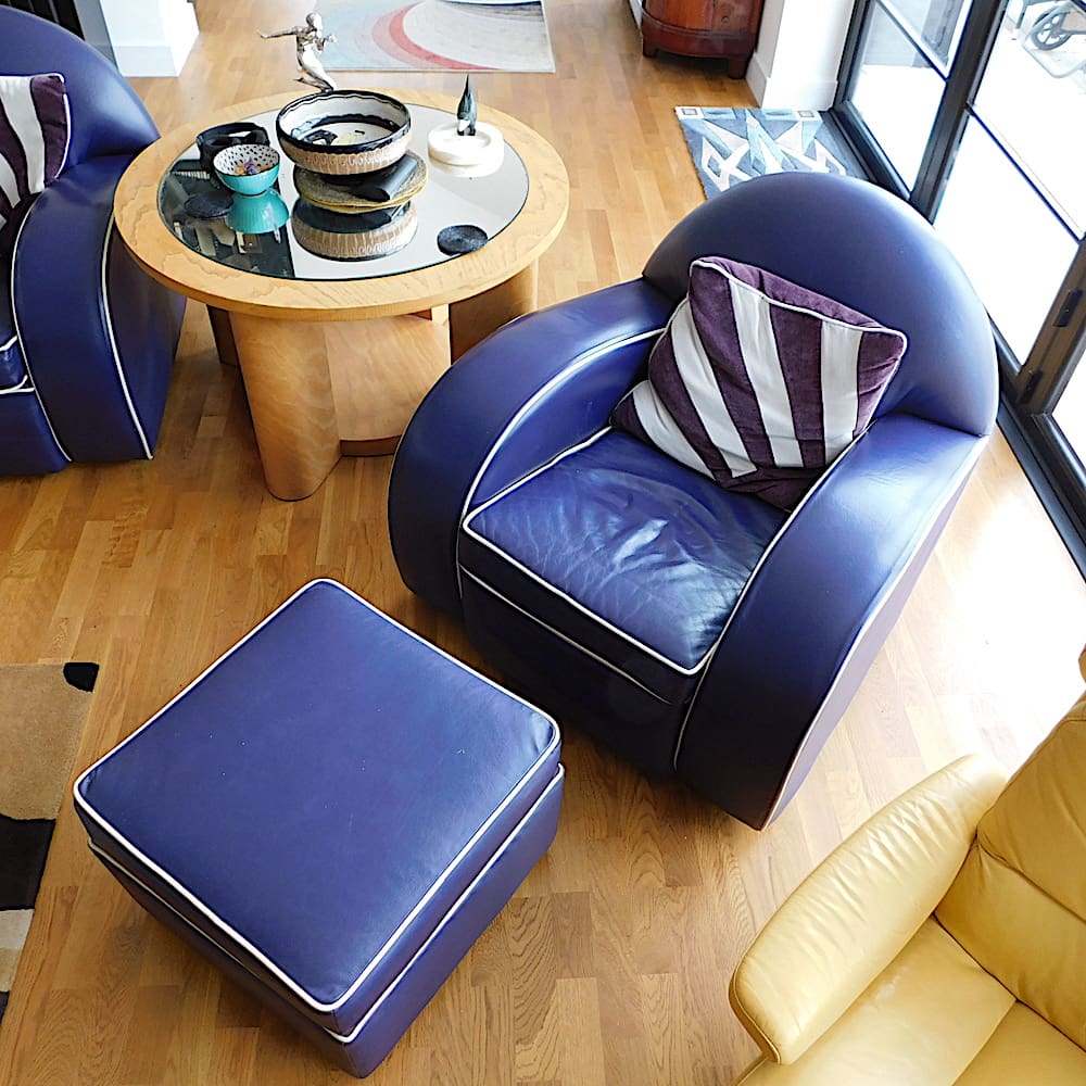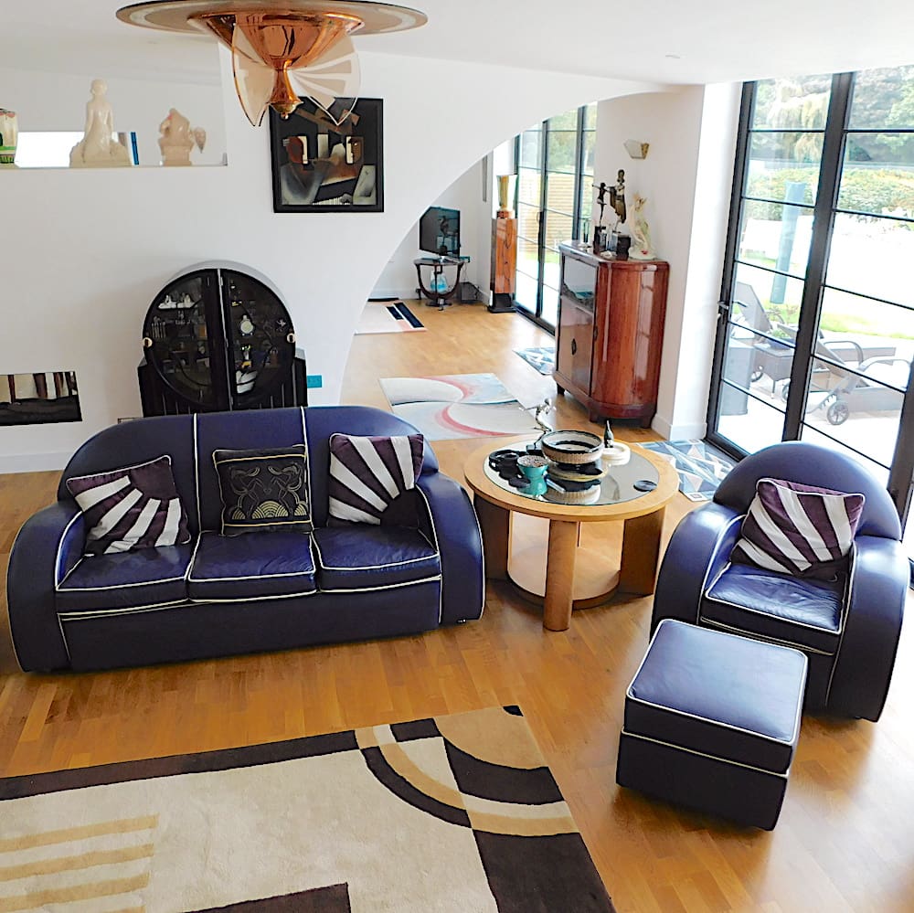 A three seater sofa, armchair and matching footstool with fabric sunray cushions.