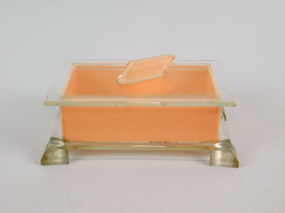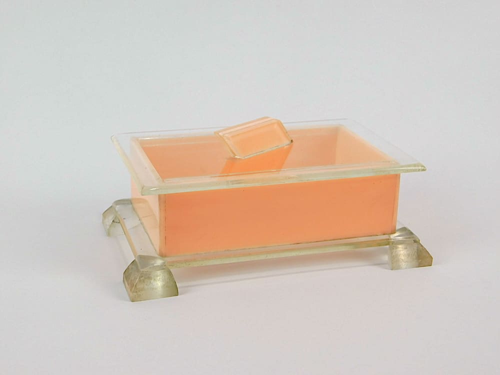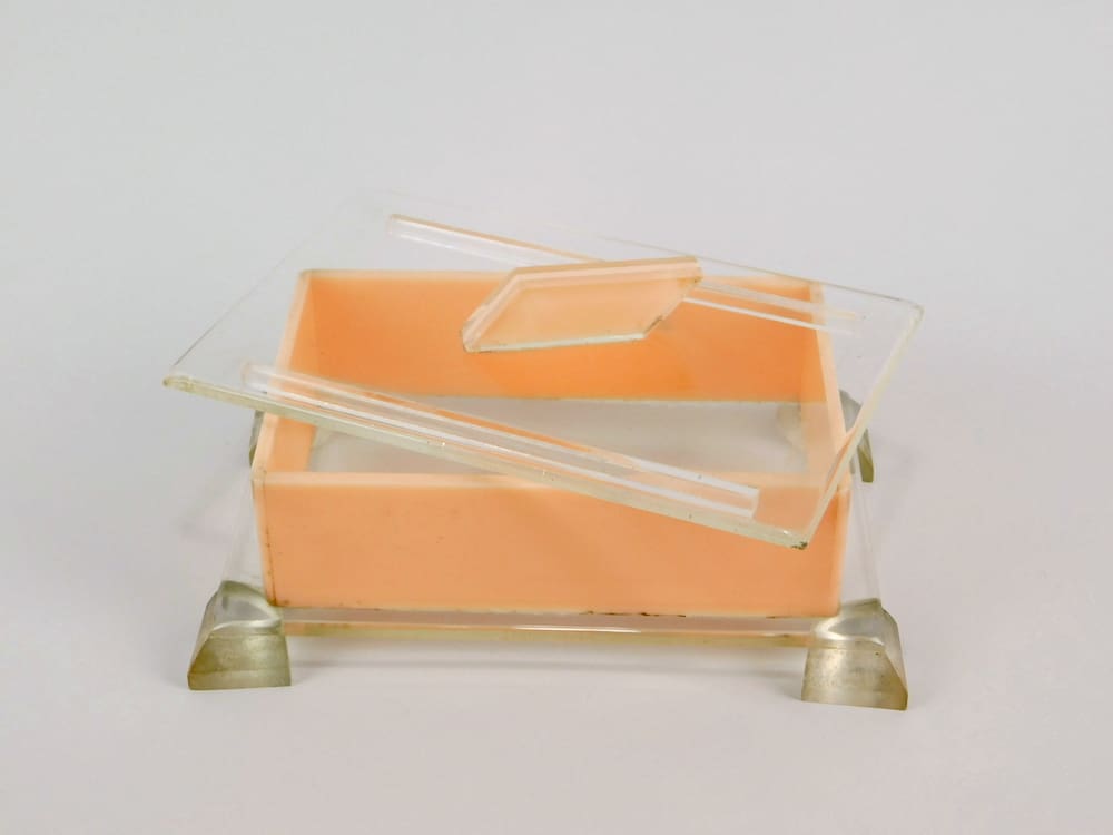 A lovely art deco clear and peach lucite vanity or jewellery box.