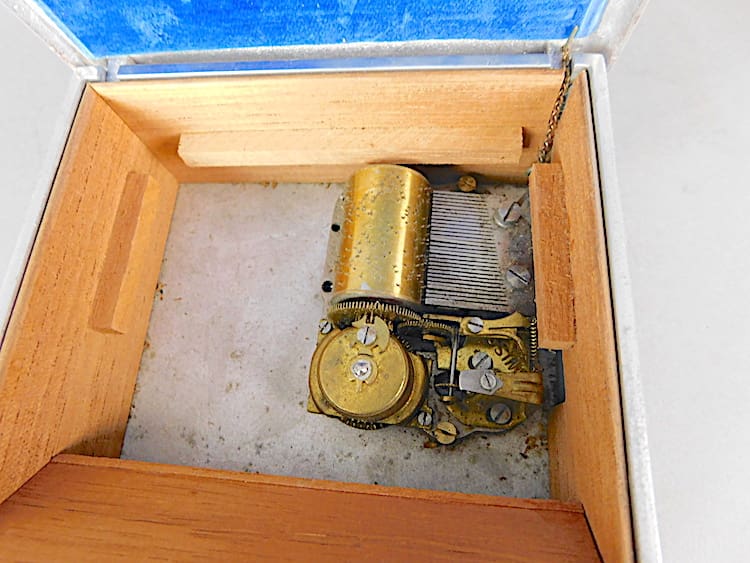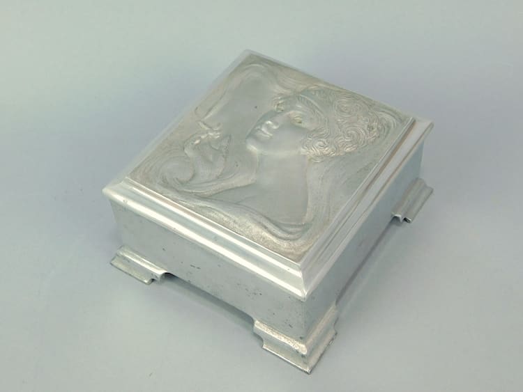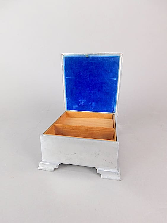 English Art Deco musical jewellery box. Cast aluminium case lined in cedar wood. It plays a tune but it is intermittent and probably needs a service.