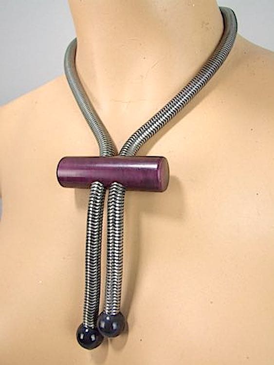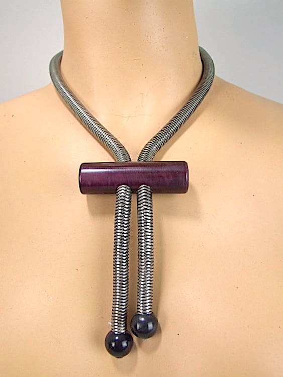 Early 1930s art deco snake chain necklace with purple and black galalith beads and rod on a chunky snake chain.