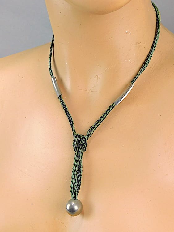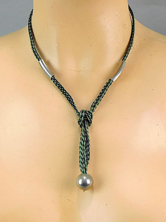 Early 1930’s Jakob Bengel necklace. A chrome ball hanging on an original cord. This necklace also retains its original Bengel stock label, I have left it with it as it is part of its history.