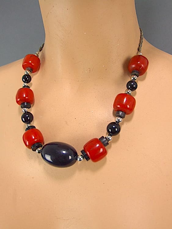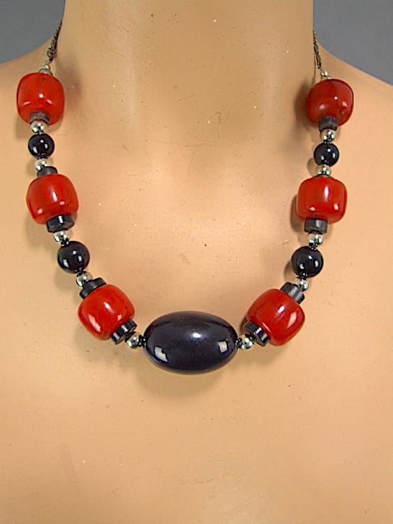 Black and red galalith bead necklace with intricate chain detail. Made in the early 1930s by Jakob Bengel.