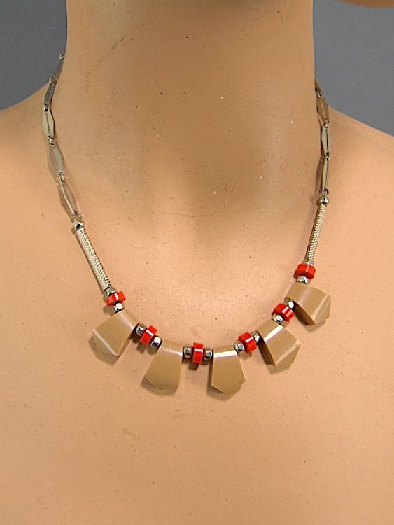 Art deco modernist necklace in chromed metal with light brown and coral galalith detailing. Made by Jakob Bengel in the rely 1930s.