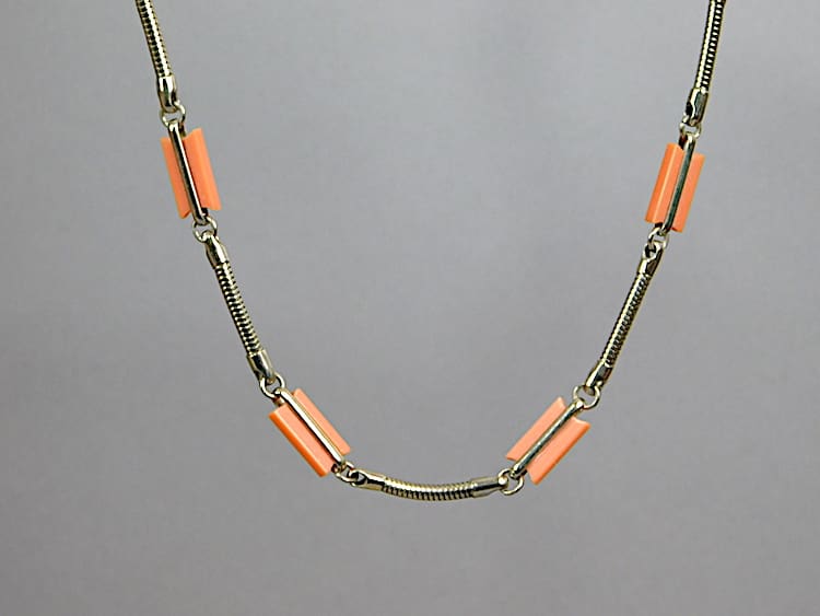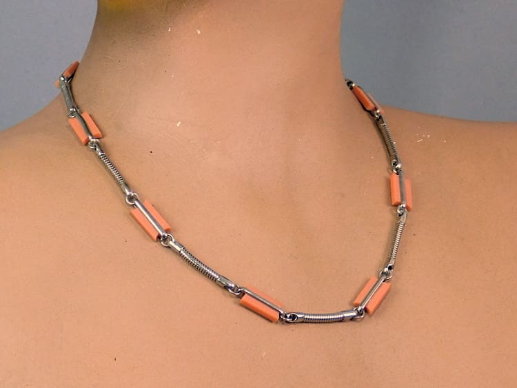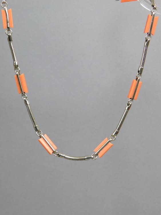 Art deco peach galalith necklace by Jakob Bengel. Early 1930s with snake chain detail.