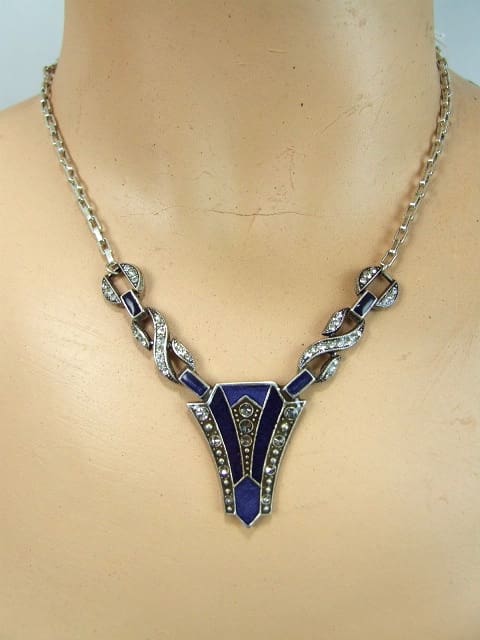 Blue enamel art deco necklace by Pierre Bex with signature panel to the back.