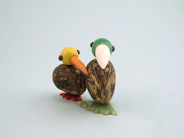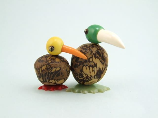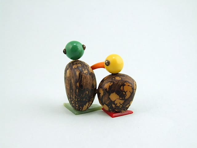A pair of vintage art deco nut birds with phenolic heads and feet.