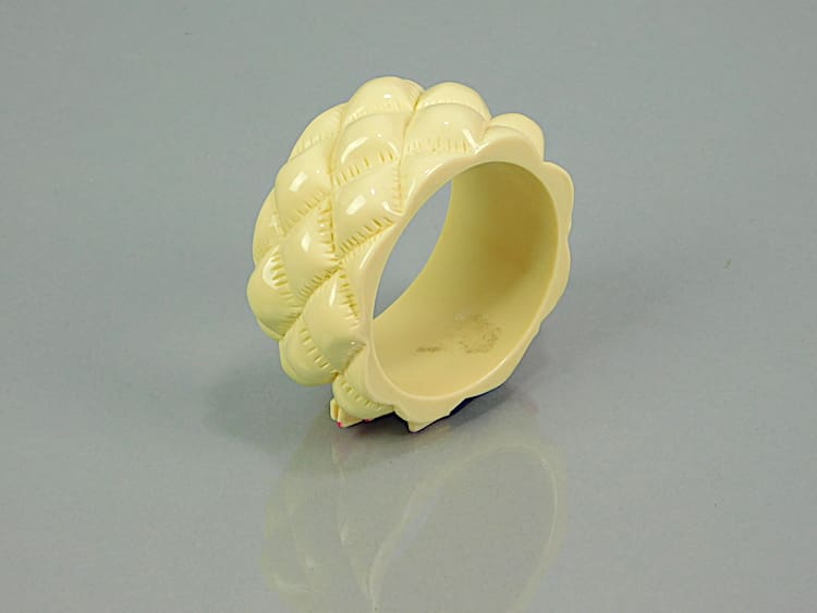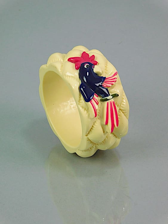 French phenolic resin bangle with a carved hand painted parrot. It will fit a small to medium sized wrist.