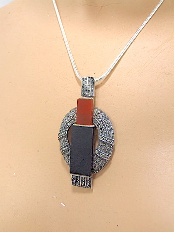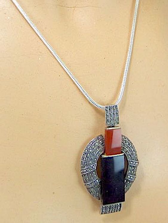 French Art Deco pendant necklace in silver, onyx and rhinestone. Unmarked but I believe by Theodore Fahrner. On a silver snake chain.