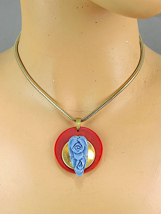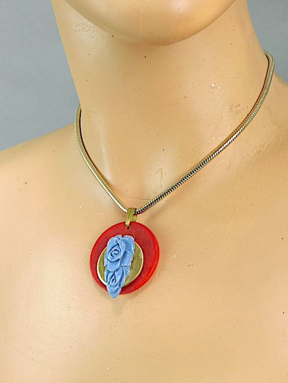 Phenolic art deco necklace, purple stylised floral panel on a chrome and red phenolic pendant panel. Hanging on a snake chain.
