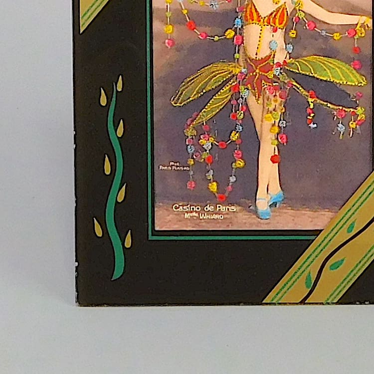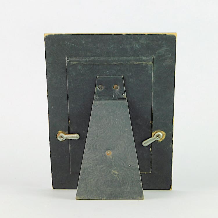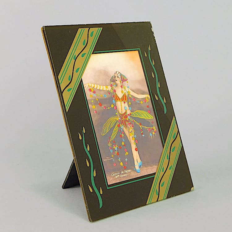 Reverse floral themed painted glass picture frame made in the USA with desk mounting support.