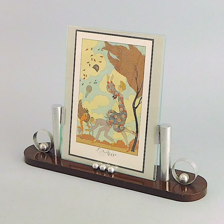 Modernist French photo frame of rosewood and polished aluminium, in an interesting ball and circle design with chromed pillar supports.
