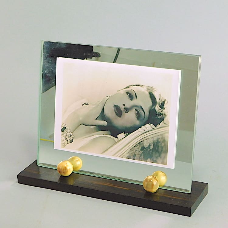 French art deco photo frame with a Macassar base and phenolic balls detail. The back panel of glass is mirrored.