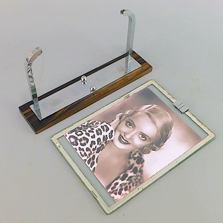 French macassar ebony and chromed metal photo frame. Mirror edging to the glass.