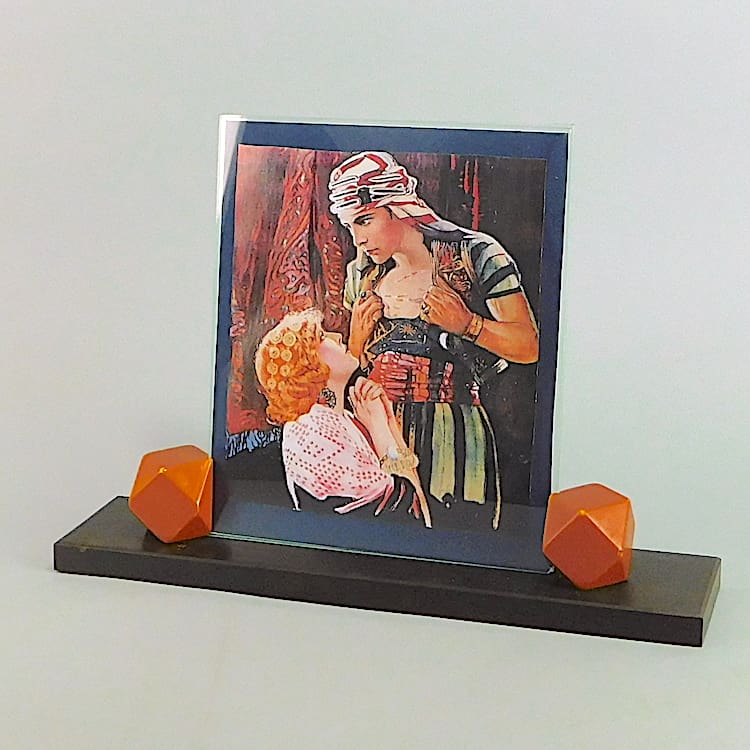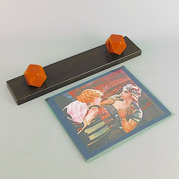 French art deco photo frame with chromed strip between patinated shaped supports.
