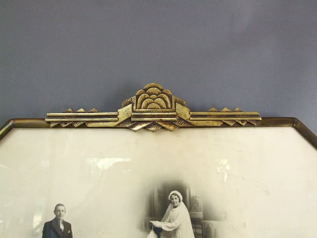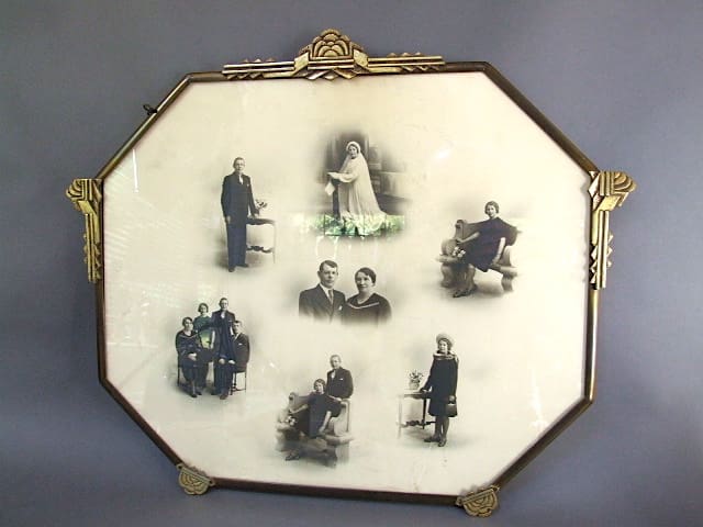 Large European wall hanging picture frame with bronze mounts with art deco motifs. I have left the original Belgian family photo montage in the frame which can be left in the back as a backing board, thereby keeping its original contents intact for future generations. Could possibly be converted to a mirror. Stamped Ballista to the metal.