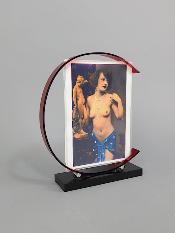 Medium sized red and black phenolic Plexi-glass photo frame. Marked under the base Sarsparilla 1985.