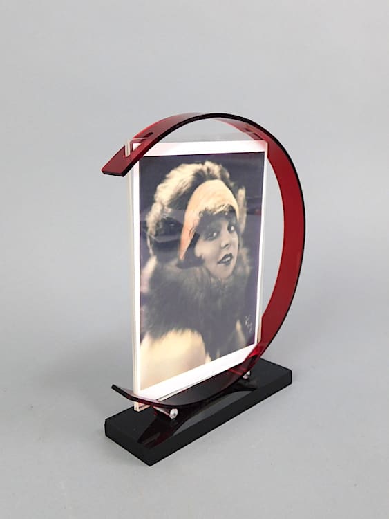 Medium sized red and black phenolic Plexi-glass photo frame. Marked under the base Sarsparilla 1985.