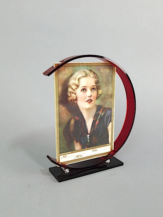 Smaller sized red and black phenolic Plexi-glass photo frame. Marked under the base Sarsparilla 1985.